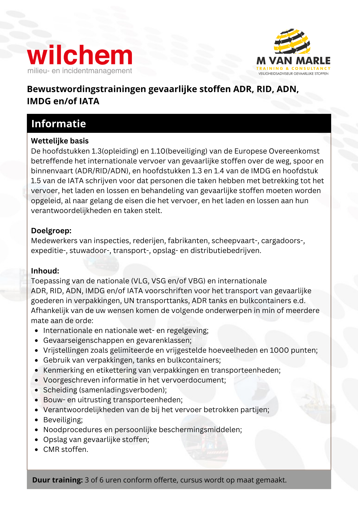 - 3 uren: Bewustwordingstraining gevaarlijke stoffen ADR, RID, ADN, IMDG en/of IATA