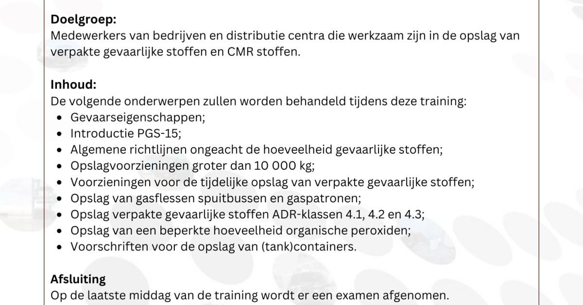 Bekijk hierbij alle informatie omtrent de cursus: Opslag van verpakte gevaarlijke stoffen en CMR stoffen PGS 15.